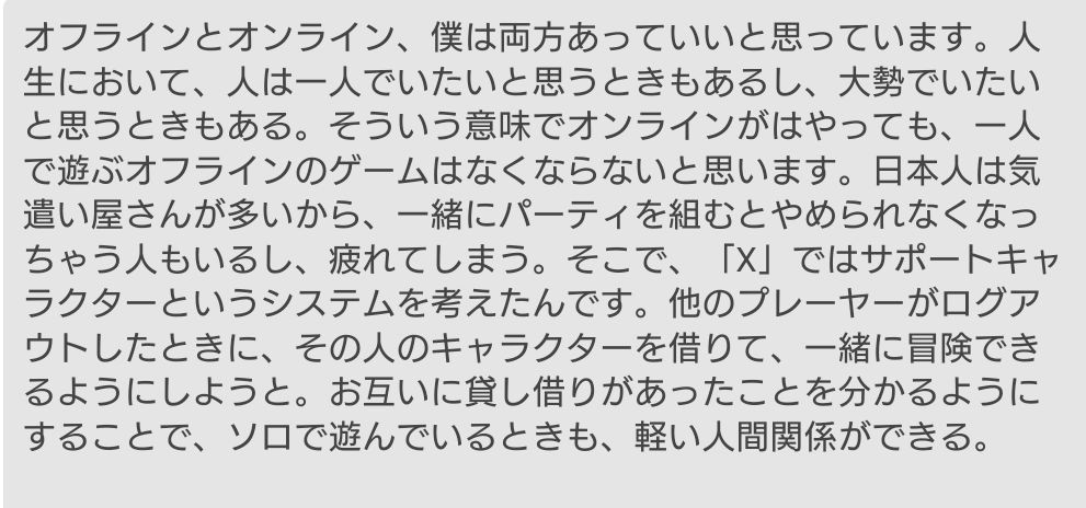 全部一人で完結できるけど、ゲーム内には中の人がいる人間がいてジャンプとか仕草とか釜撫でとかで非言語コミュニケーションが生まれるのがすごく楽しい