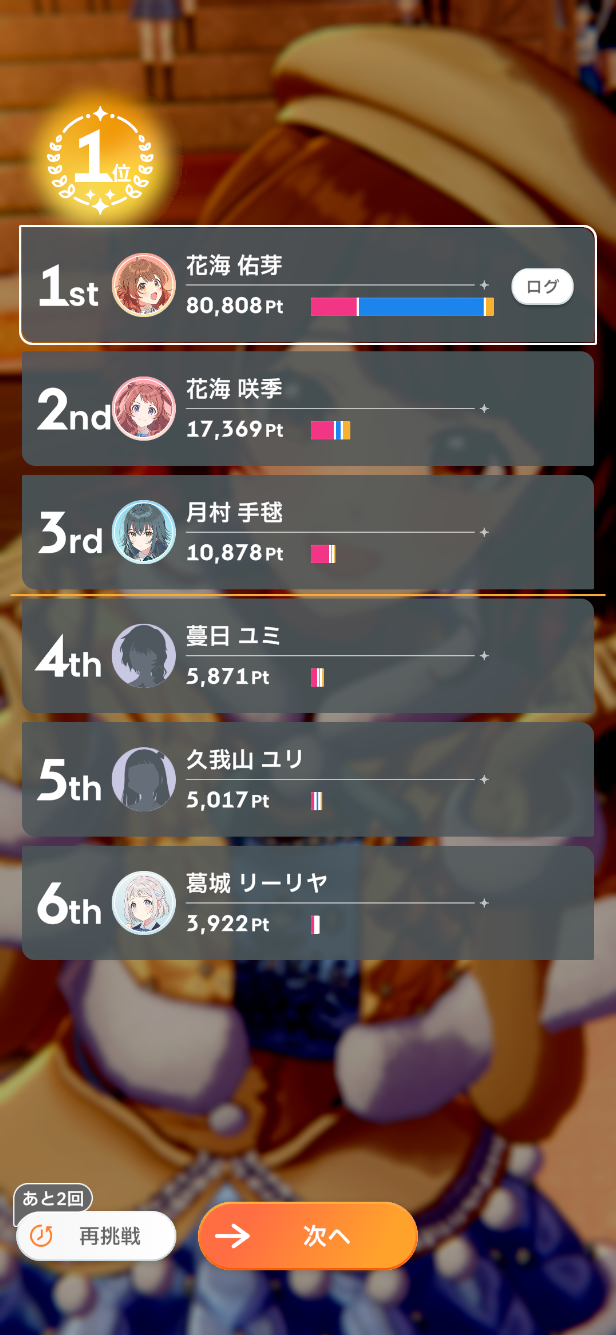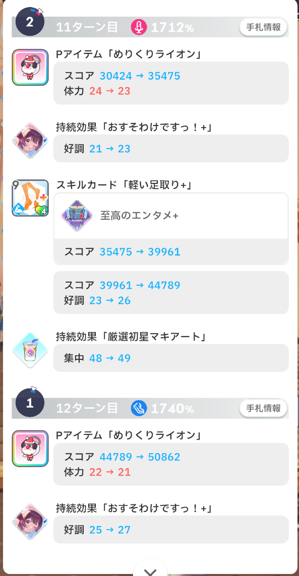 11/28分(5日目)2敗昨日から結構きわどい戦いになってたから全戦落としてもおかしくなかったんだけど案の定極端な落とし方をしてしまったステージ1はてまりとせなを何とかしないといけない 2にめゃが入ったから1にハロウィン篠澤さんinできそうステージ3も温泉姫崎さん以外は平均25,000程度なのでもうちょっと強くしないとキツイ やはり冠菊ことねはアイテムと相性良かったか